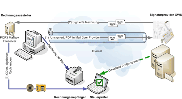 Auch nach dem 01.07.2011 gelten für den Rechnungsversand per E-Mail und Fax Vorschriften. Hiernach muss der Rechnungsaussteller Echtheit und Unversehrtheit der Rechnungen jederzeit nachweisen können. Das einzige derzeit sogar EU-weit standardisierte Verfahren hierfür ist die „qualifizierte“ elektronische Signatur nach SigG. Kann dieser Nachweis nicht geführt werden, sind Strafen beim Rechnungsaussteller und beim Rechnungs-Empfänger möglich. Dies gilt übrigens gleichermaßen nur für gewerbliche Rechnungsempfänger wie für private.